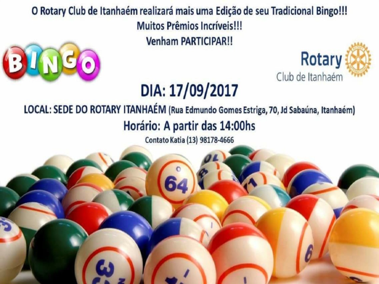 O Rotary Club de Itanhaém realizará mais uma edição de seu tradicional bingo beneficente com muitos prêmios incríveis. Venham participar.