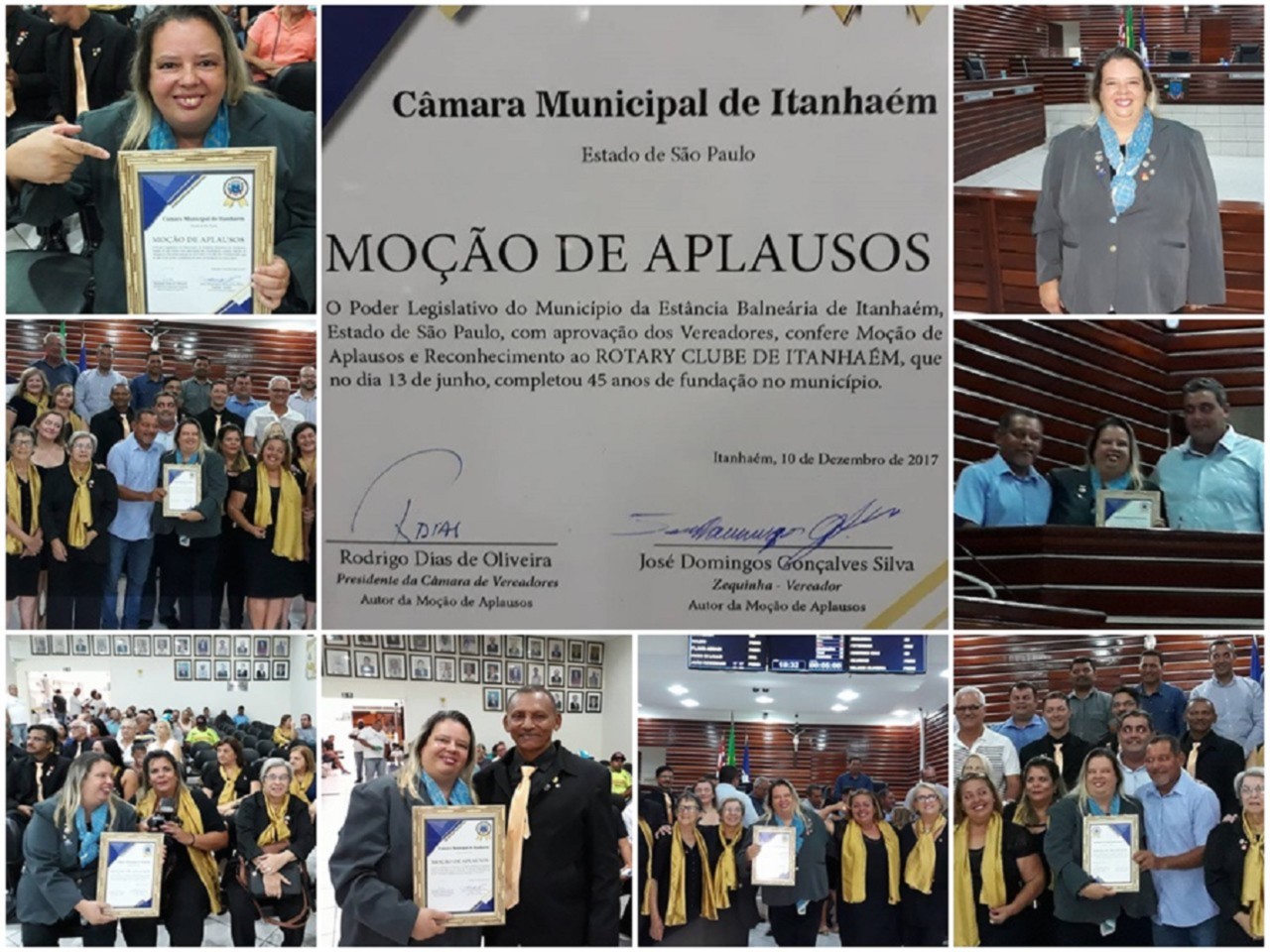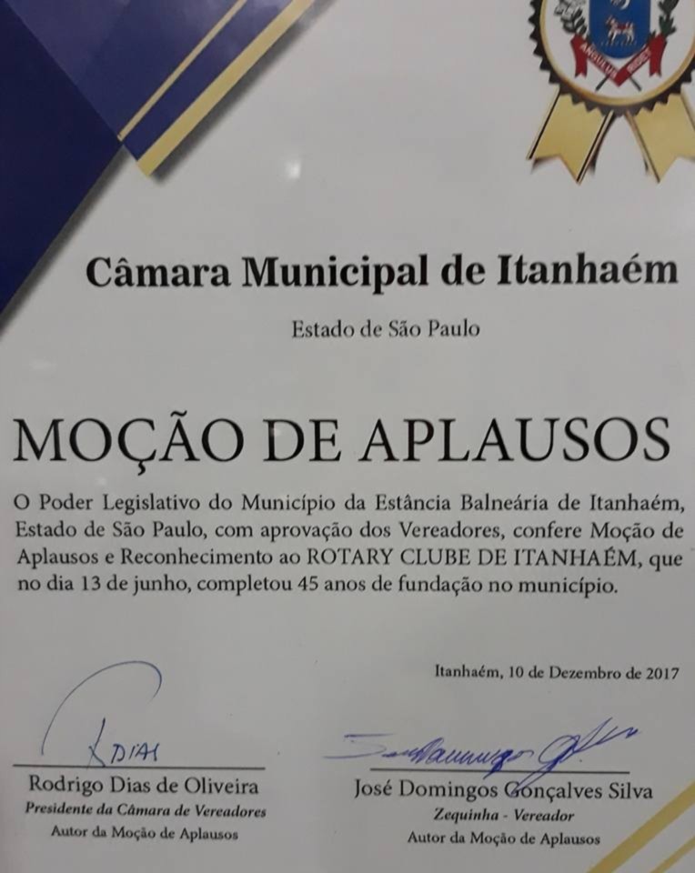 O Poder Legislativo da Estância Balneária de Itanhaém / SP, em sessão solene realizada em 19/02/2018, conferiu Moção de Aplauso e Reconhecimento ao Rotary Club de Itanhaém - Distrito 4420.