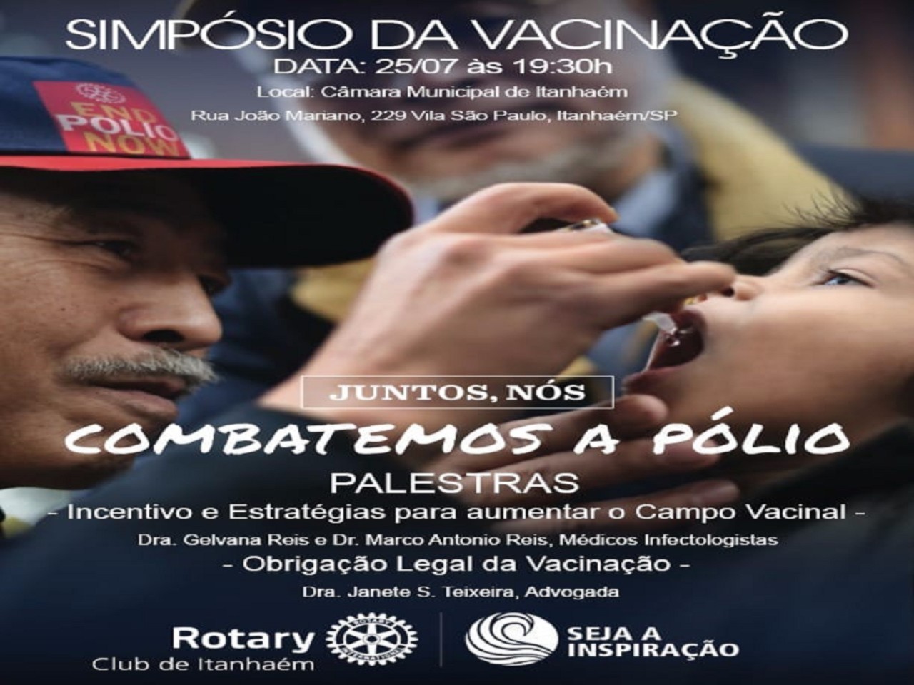 O Simpósio da Vacinação será nesta quarta-feira, 25/07, às 19h30 na Câmara Municipal de Itanhaém (R. João Mariano 229 - V. São Paulo - Itanhaém) e contará com a participação de autoridades civis e rotárias do distrito 4420.