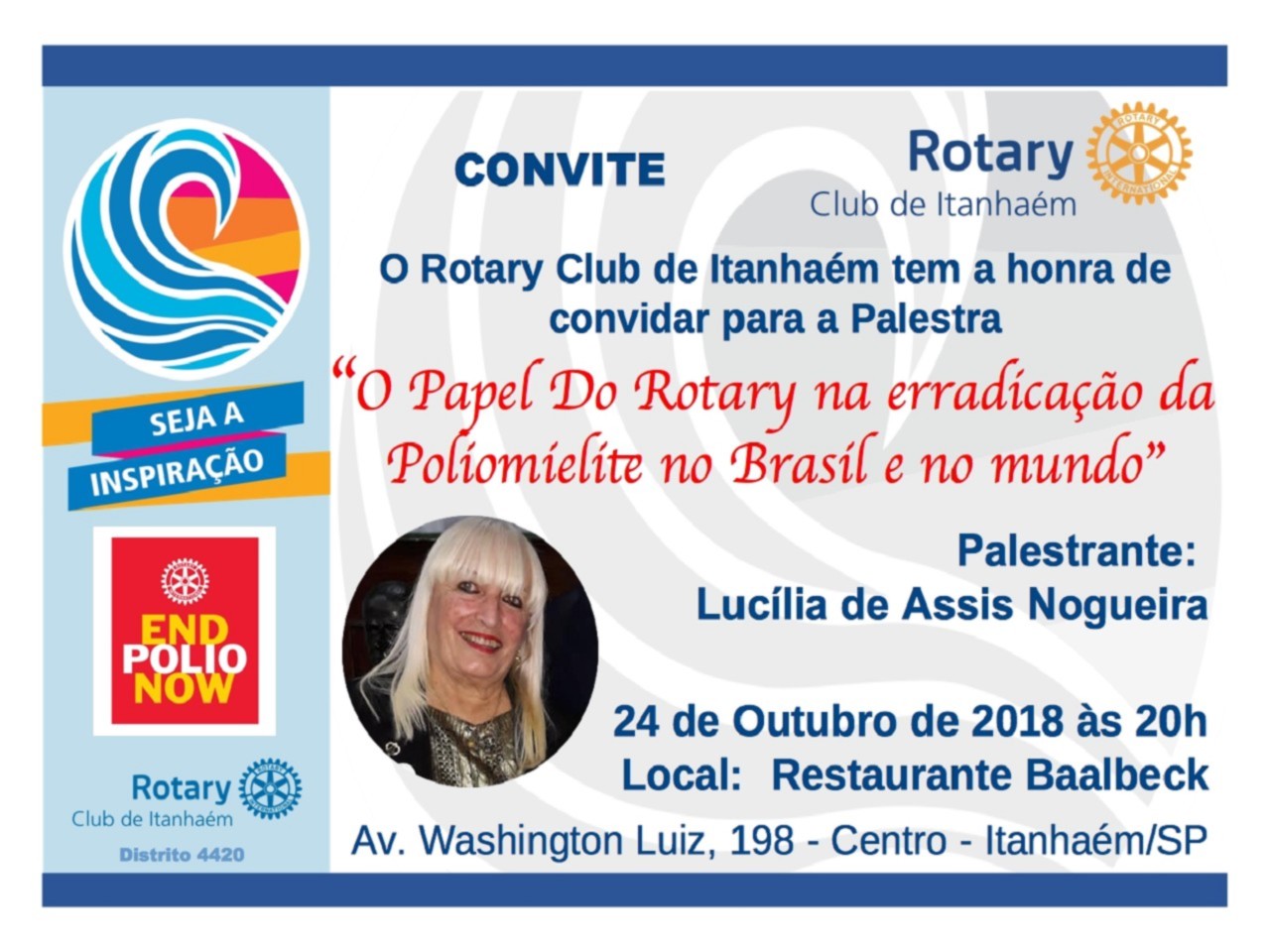 Reunião Ordinária do Rotary Club de Itanhaém presidida pela Presidente Inspiradora Maricy Merçon Braz, em comemoração ao dia Mundial da Polio com a Palestra (O PAPEL do Rotary na erradicação da Poliomelite no Brasil e no mundo).
